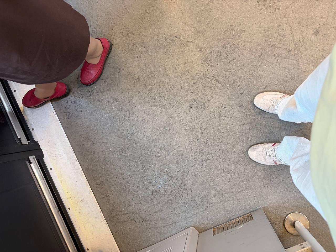 На полу в электричке и обуви пассажиров остаются черные следы от осадков